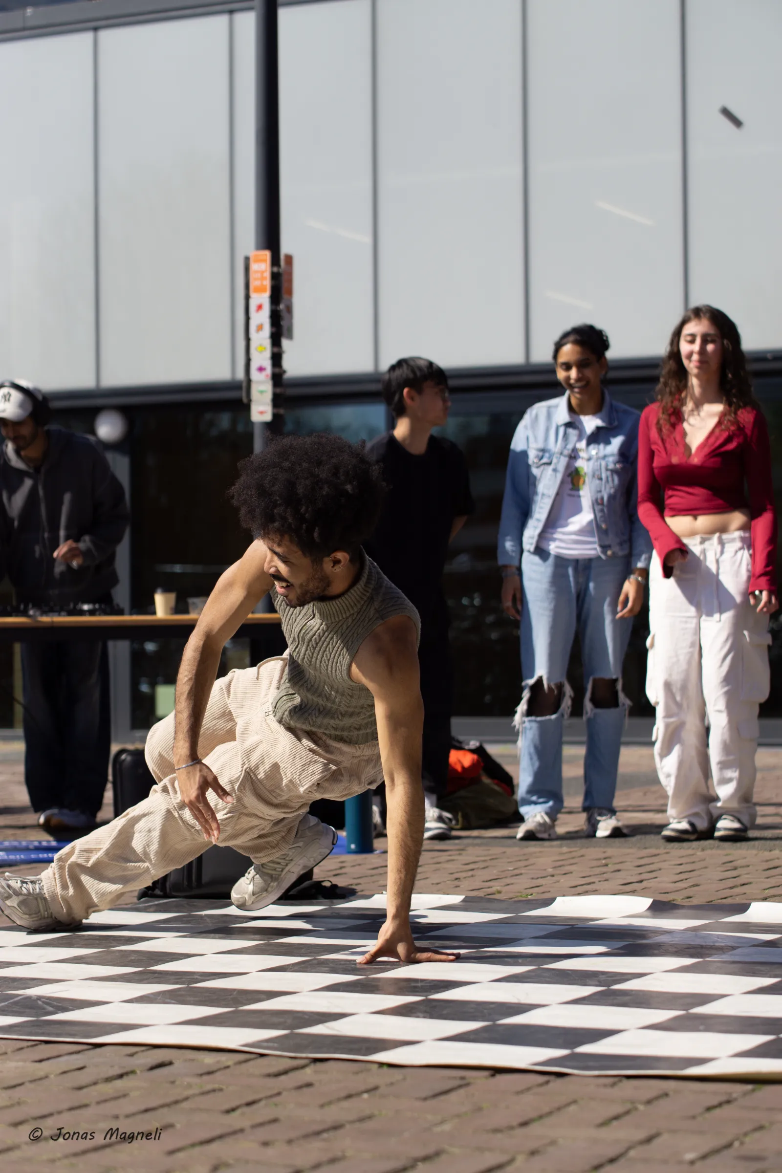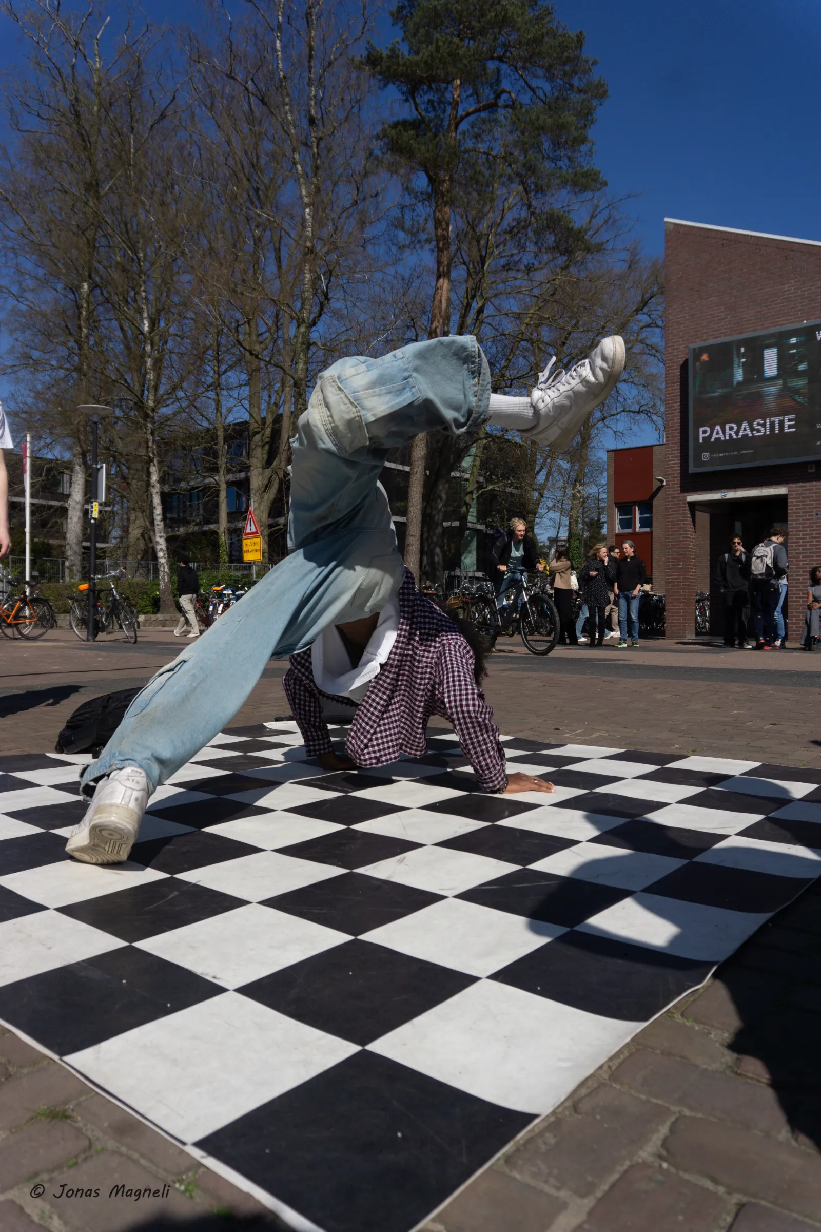 We gathered at the entrance of Vrijhof for some outdoor dancing! Our dancers came together to share their skills, vibe with each other, and enjoy the spring atmosphere. It was open for anyone to join and show off some of their moves. We had as DJ Tilan and as photographer Jonas Magneli, both member of the association. We had a great variation of dance styles from breakdance and popping to feminine and modern.Â